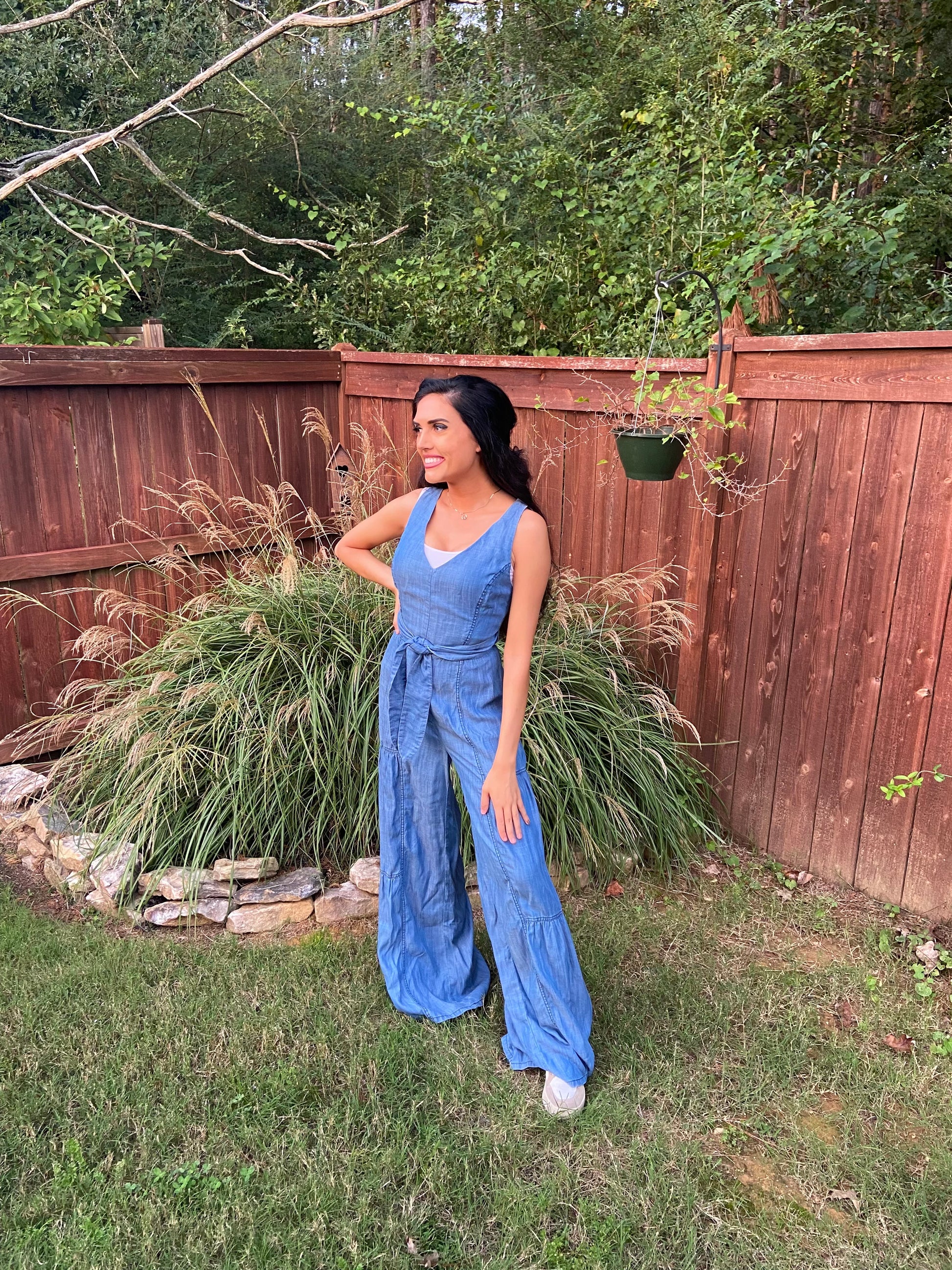 This bohemian chic jean jumpsuit is as soft and comfortable as it is versatile. It is a great addition to your wardrobe.